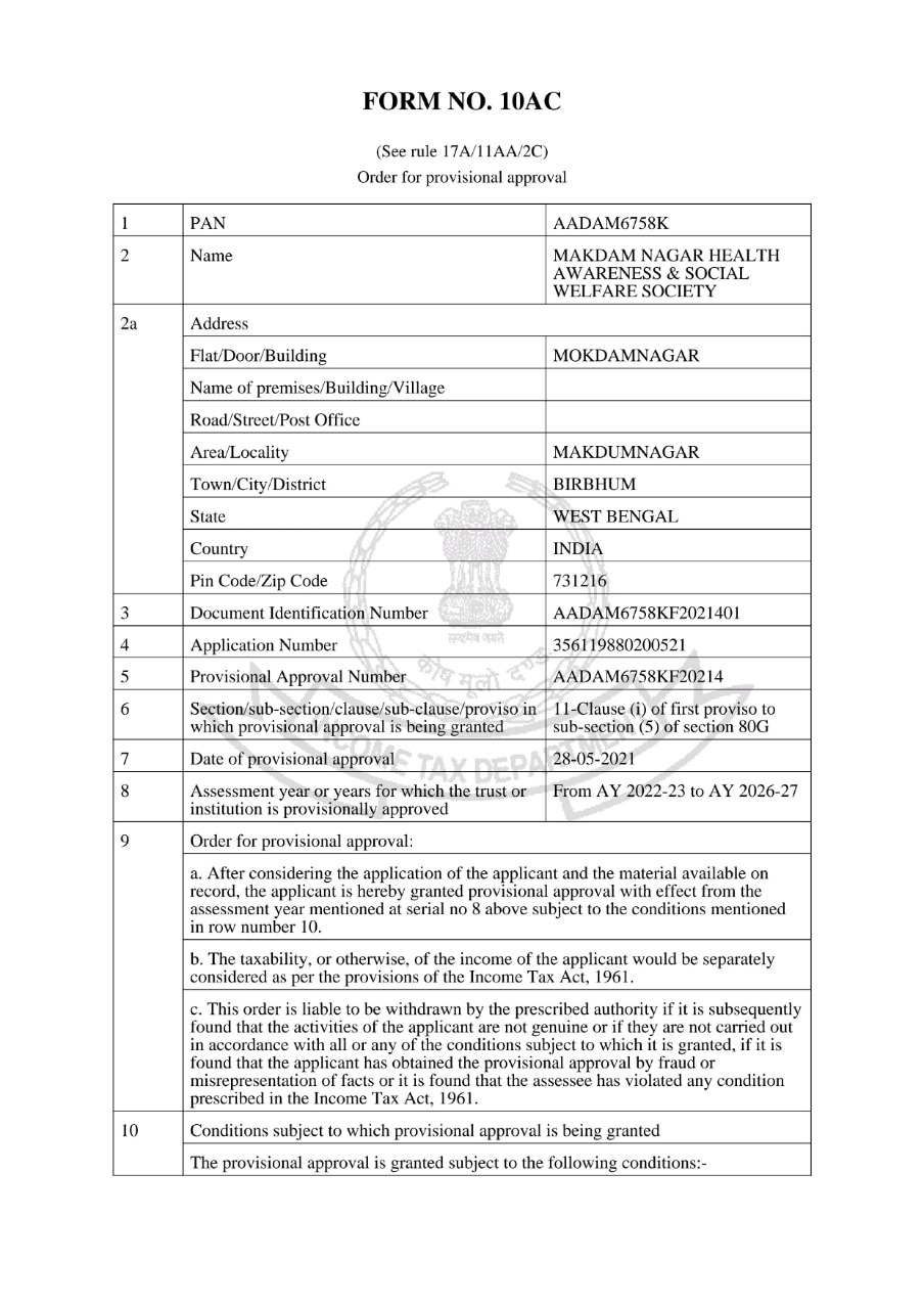 Makdam Nagar Health Awareness & Social Welfare Society| Sl No | Document Name | Number |